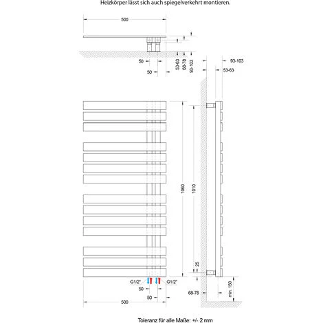 Einfach die Halter an die Wand schrauben, den Heizkörper einhängen und fixieren. Die Halterungen bieten einen Verstellbereich von 10 mm, sodass ein Fliesenversatz o.ä. ausgeglichen werden kann.